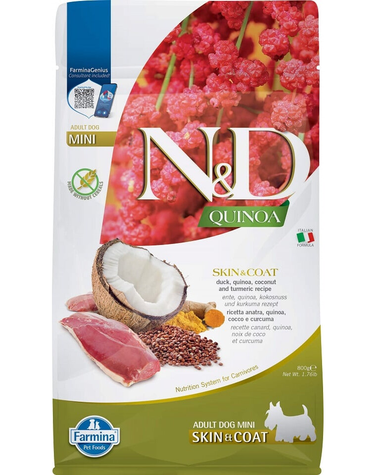 N&D Quinoa Skin & Coat è un alimento dietetico completo per cani, consigliato per la riduzione di intolleranze a ingredienti e sostanze nutritive.