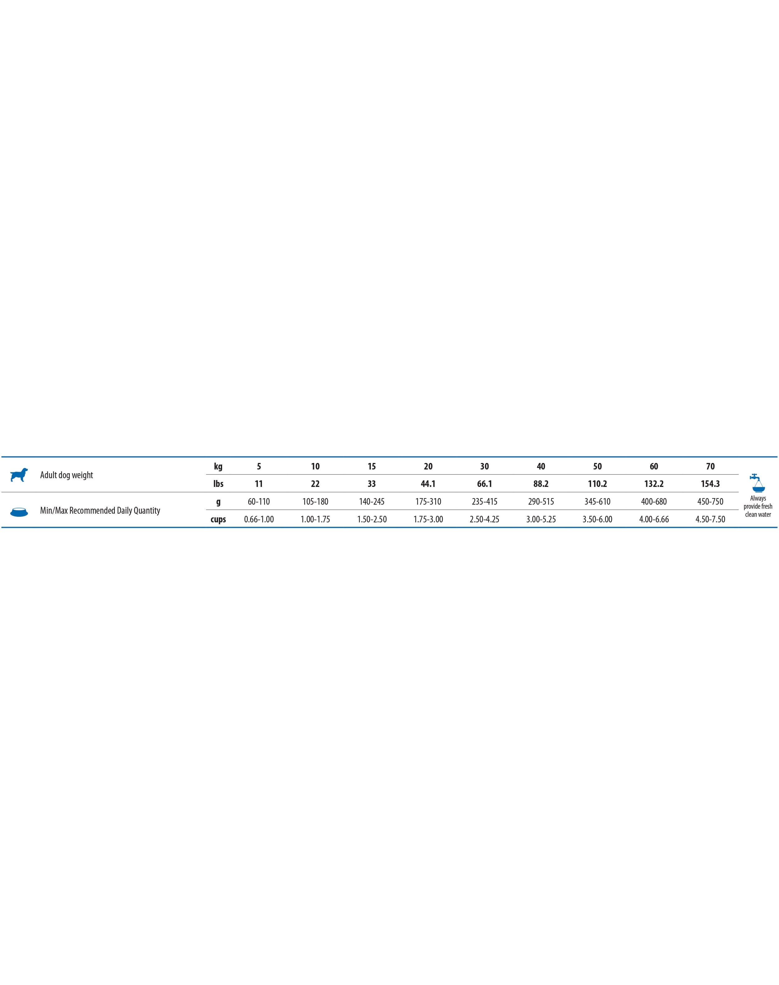 proteina grezza 23,00%; grassi grezzi 12,00%; fibra grezza 2,80%; umidità 9,00%; ceneri grezze 7,90%; calcio 1,10%; fosforo 0,90%; acidi grassi Omega-3 0,40%; acidi grassi Omega-6 2,20%; DHA 0,20%; EPA 0,10%; glucosamina 1200mg/kg; condroitina solfato 900mg/kg.