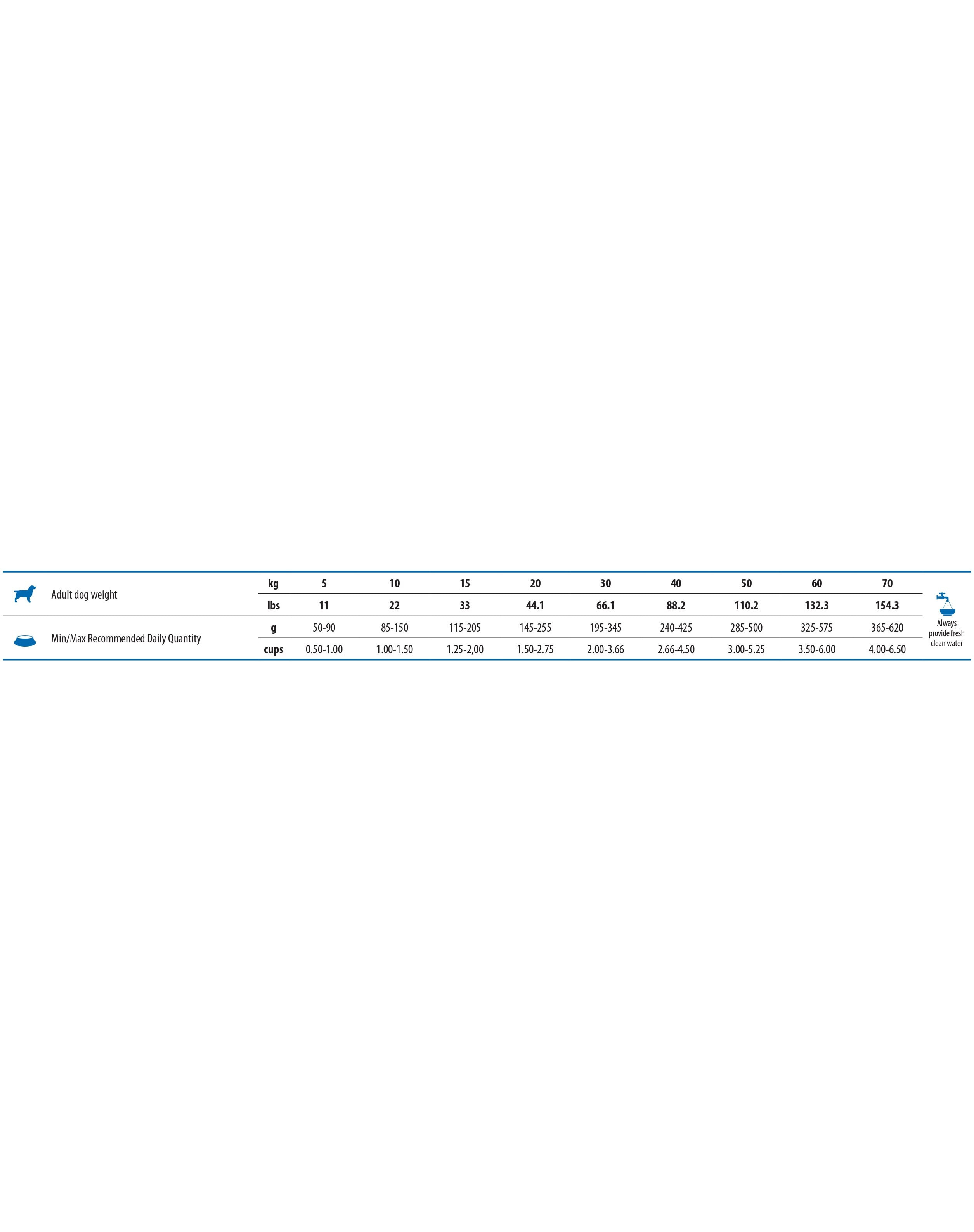 proteina grezza 28,00%; grassi grezzi 8,00%; fibra grezza 8,20%; umidità 9,00%; ceneri grezze 7,90%; calcio 0,90%; fosforo 0,80%; sodio 0,30%; potassio 0,65%; magnesio 0,5%.65%; magnesio 0,12%; acidi grassi Omega-6 1,20%; acidi grassi Omega-3 0,25%; DHA 0,12%; EPA 0,10%; glucosamina 1200mg/kg; condroitina solfato 900mg/kg.