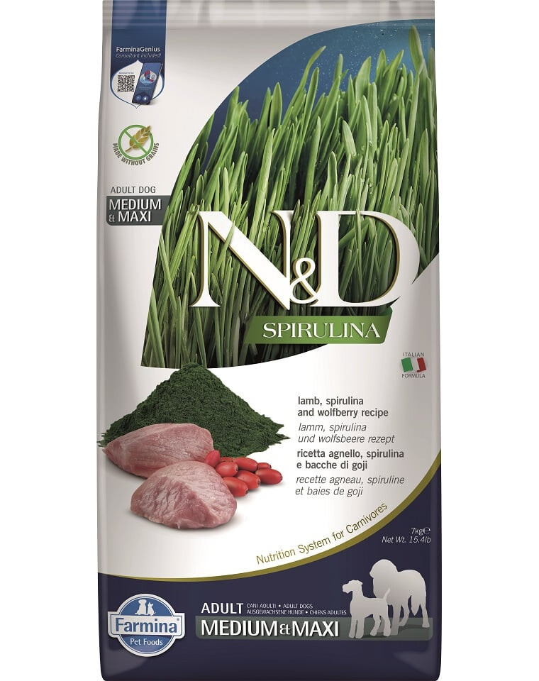 Alimento completo per cani adulti di taglia media e grande con agnello, spirulina e bacche di Goji.