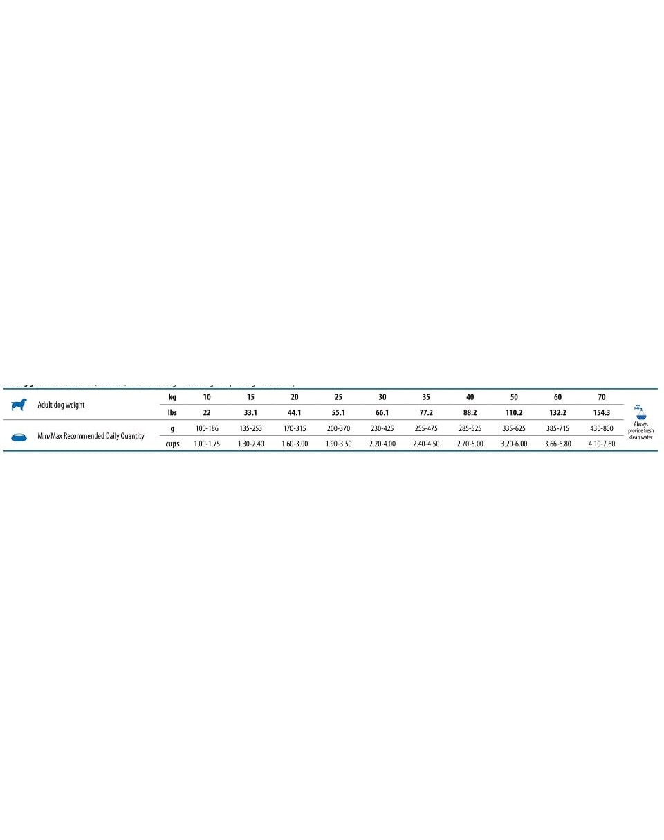 Proteina grezza 23.00%; Grasso grezzo 18.00%; Fibra grezza 2.90%; Umidità 9.00%; Ceneri grezze 7.90%; Calcio 0.90%; Fosforo 0.80%; Omega-6 1.60%; Omega-3 2.30%; DHA 1.00%; EPA 0.70%; Glucosamina 1200mg/kg; Solfato di Condroitina 900mg/kg.
