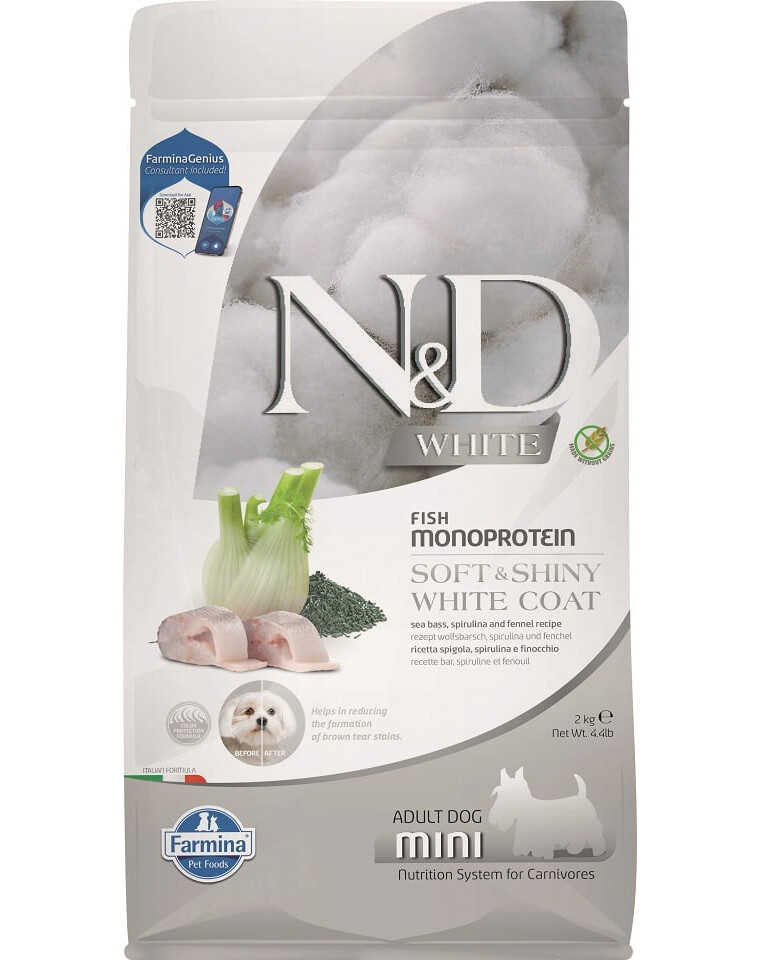 Alimento completo per cani adulti di piccola taglia con branzino, spirulina e finocchio.