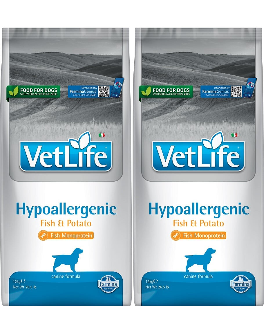 Farmina Vet Life Hypoallergenic Fish & Potato è un alimento dietetico completo per cani per ridurre le intolleranze ad ingredienti e sostanze nutritive; supportare le funzioni cutanee in caso di dermatosi ed eccessiva caduta dei capelli.