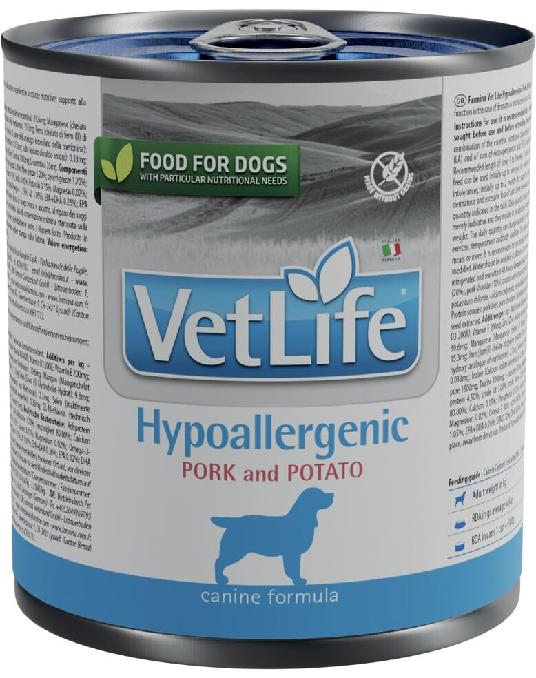 FARMINA Vet Life Natural Diet Dog Hypoallergenic Pork & Potato è un alimento dietetico completo per cani utilizzato per ridurre le intolleranze agli ingredienti e ai nutrienti e per supportare la funzione cutanea in caso di dermatosi e perdita di pelo.