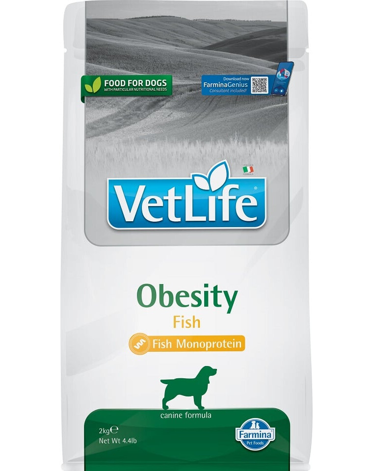 Farmina Vet Life Obesity Fish è un alimento dietetico completo per cani per ridurre il peso corporeo in eccesso e regolare l'apporto di glucosio (diabete mellito).