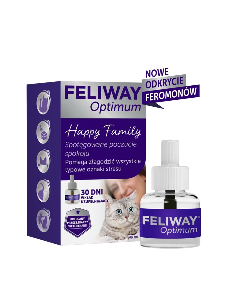 FELIWAY Optimum è un preparato avanzato di feromoni per gatti sotto forma di diffusore e ricarica. FELIWAY Optimum aiuta a combattere più segnali di stress, in più situazioni, e calma i gatti meglio che mai.