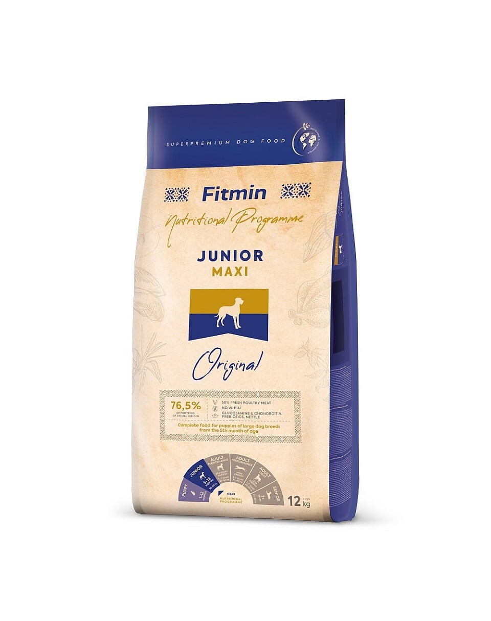 FITMIN dog maxi junior è un alimento secco completo indicato per cuccioli e giovani cani di razze grandi e giganti a partire da 5 mesi di età con attività fisica normale o media e con un tratto digestivo sensibile (alimento senza frumento).
