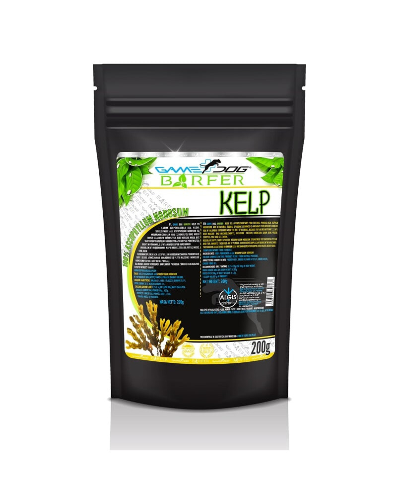 BARFER Kelp è un alimento complementare per cani. L'alga Ascophyllun nodosum in polvere è una fonte naturale di iodio (836mcg/g) e di molti altri nutrienti. Sono ricchi di vitamine C, A, D, E, K e vitamine del gruppo B, macro e microelementi, tra cui calcio, magnesio, sodio, iodio, potassio, rame, zinco e selenio.