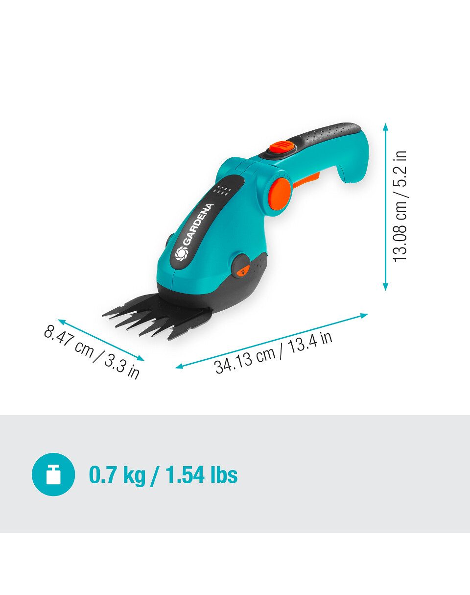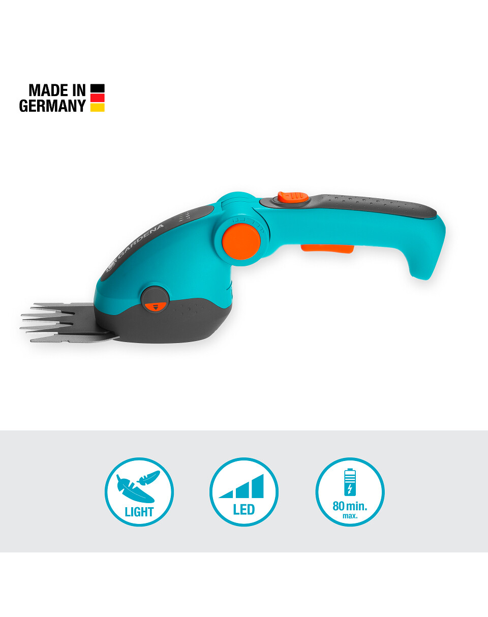Le lame affilate con precisione e con rivestimento antiaderente garantiscono una lunga durata e tagli lisci, precisi e puliti. Le lame di alta qualità sono prodotte in Germania. Le forbici hanno un design snello e un'impugnatura ergonomica. Cambia facilmente l'inclinazione del manico premendo un pulsante, assicurando la migliore posizione della mano durante il taglio. Il peso ridotto di soli 600 grammi elimina la fatica. Una batteria completamente carica dura circa 80 minuti. Il display LED mostra sempre lo stato di carica della batteria. Forbici senza fili ComfortCut Li si ricaricano tramite il cavo USB-C incluso. La sostituzione delle lame delle forbici è rapida e facile premendo un pulsante. Le forbici per erba possono essere trasformate in forbici per siepi con l'apposita lama rifilasiepi disponibile separatamente (art. n. 9863-20).