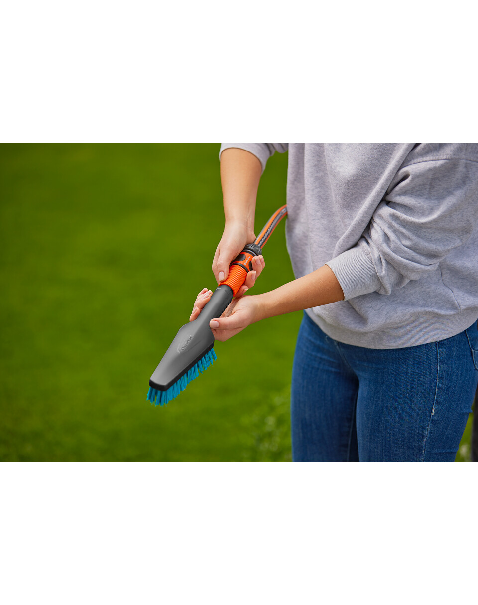 Spazzola manuale GARDENA Cleansystem S dura, garantisce una pulizia efficace e accurata a umido di aree esterne più piccole e meno delicate.