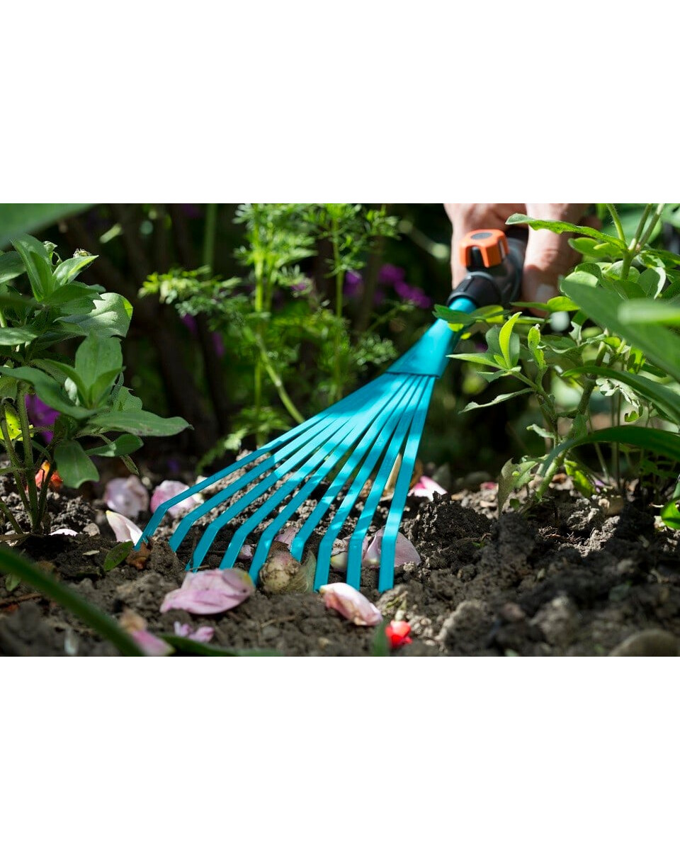 Per rastrellare foglie, erbacce e sfalci d'erba da aiuole e letti.