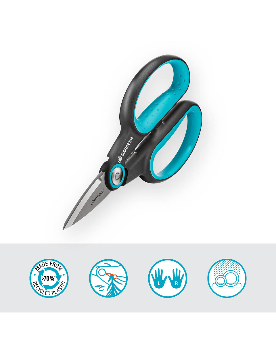 Grazie alle impugnature ergonomiche ErgoTec, le forbici sono altrettanto comode per le persone destre e mancini. Gli elementi morbidi prevengono lo scivolamento delle forbici.