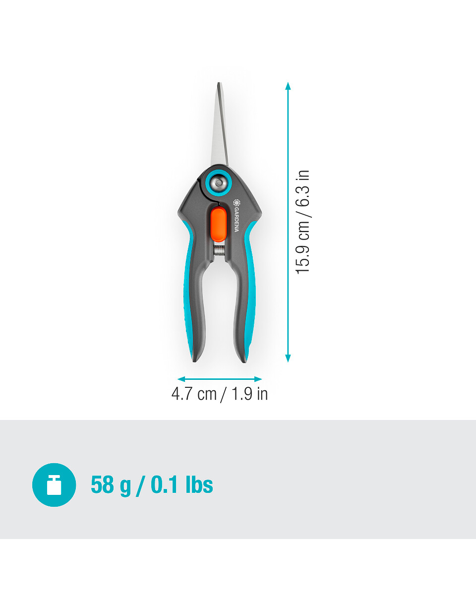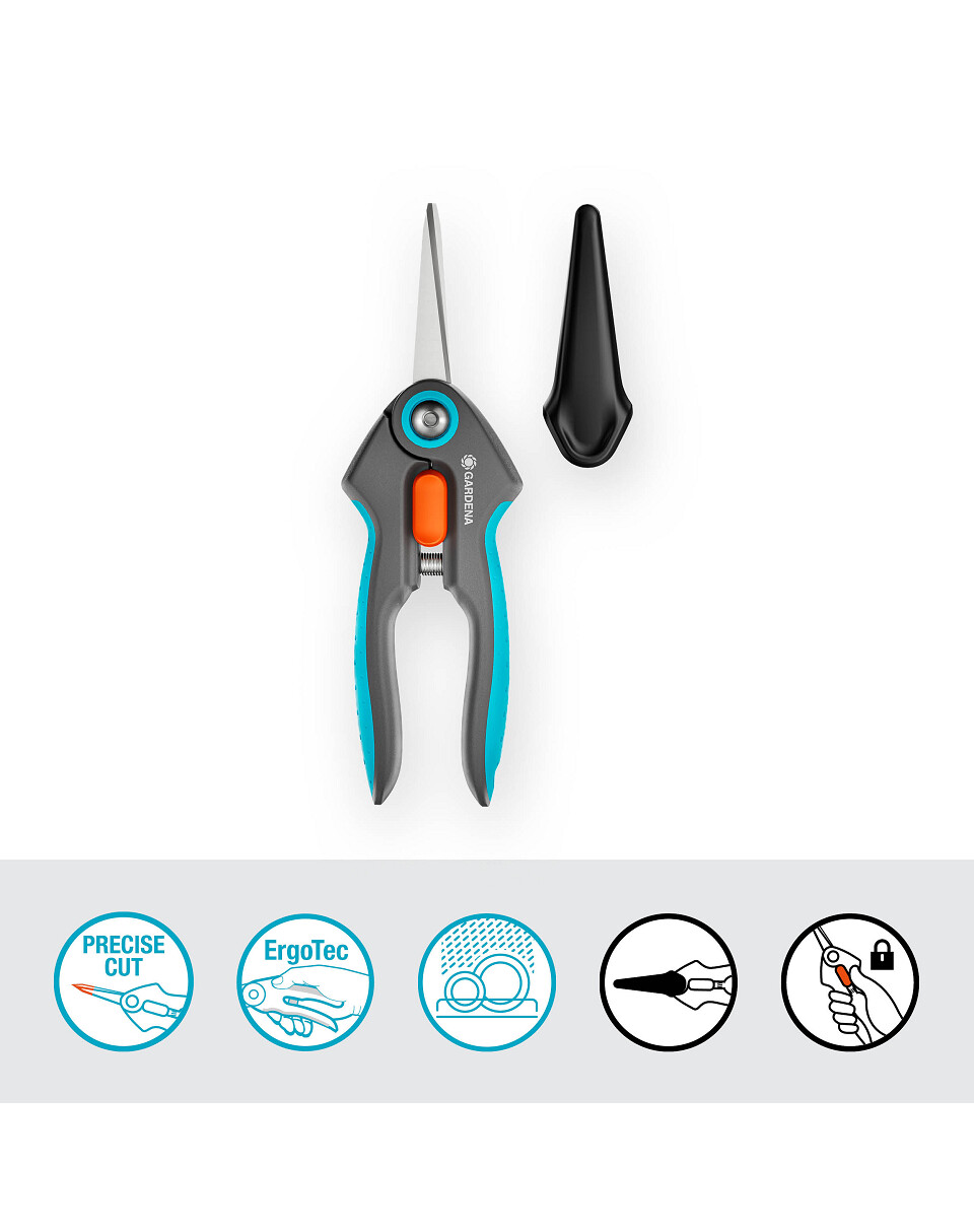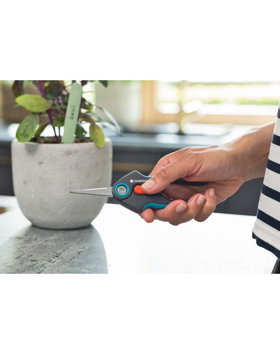 Le forbici GARDENA FreshCut sono ideali per raccogliere erbe fresche e bacche, oltre a tagliare fiori. La lama stretta e affilata è realizzata in acciaio resistente alla corrosione e durevole, e sorprende ad ogni taglio. FreshCut taglia in modo pulito e preciso fino alla punta. Le forbici per erbe e verdure funzionano anche in spazi ristretti, permettendoti di raccogliere facilmente basilico o fiori appassiti. Si adattano comodamente e in sicurezza alla mano grazie al manico ergonomico antiscivolo ErgoTec e all'impugnatura morbida. Per garantire un trasporto e una conservazione sicuri, applica la protezione inclusa sulle forbici fornite. Il meccanismo di blocco azionabile con una sola mano consente di bloccare e sbloccare facilmente le forbici. Indipendentemente dal tipo di pianta tagliata, le lame approvate per il contatto con gli alimenti non influenzano il sapore e l'odore. Per facilitare la pulizia, le forbici possono essere lavate in lavastoviglie.