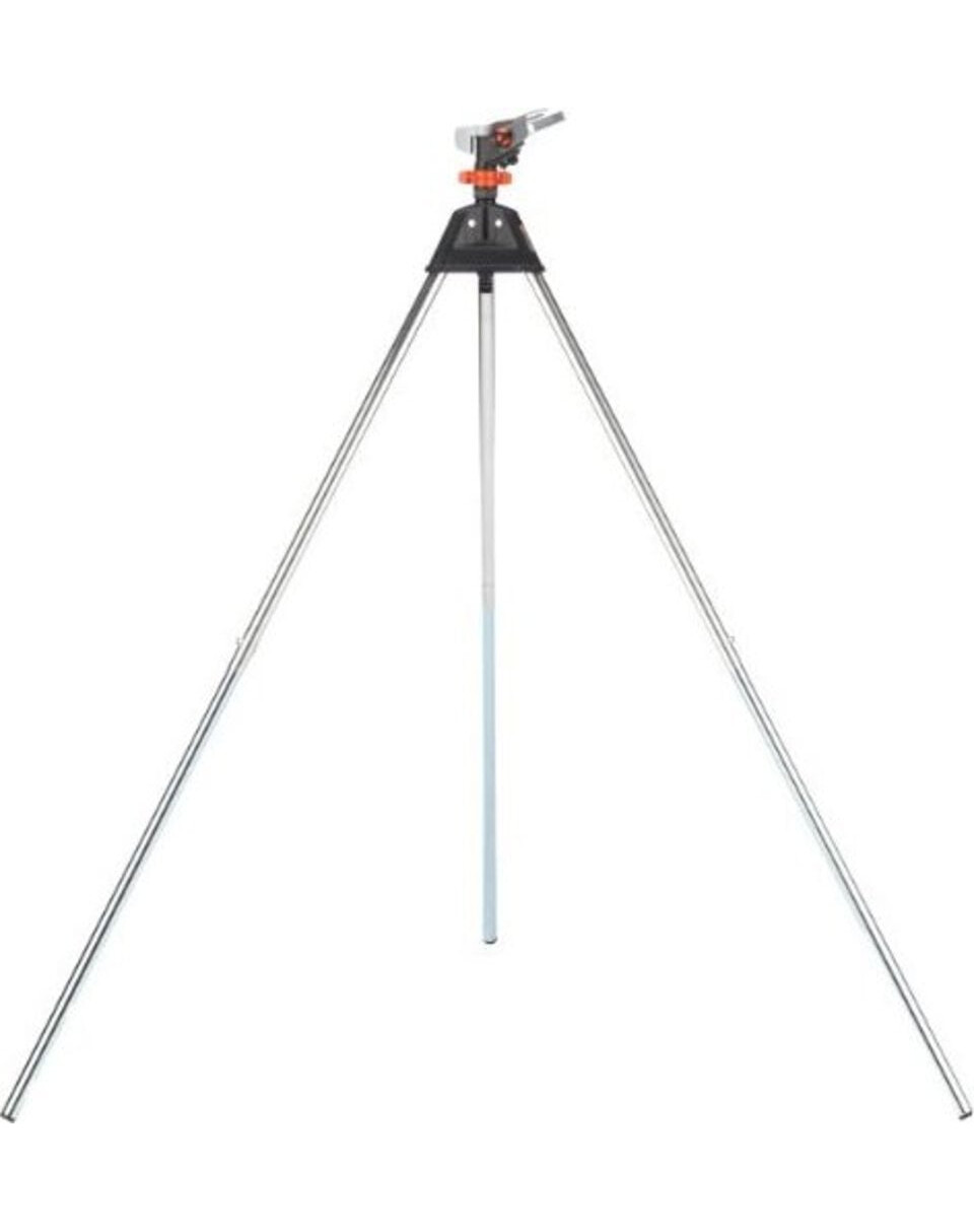 Robusto irrigatore a flagelli su treppiede pieghevole. Il dispositivo consente di irrigare in modo efficiente le piante più alte.
