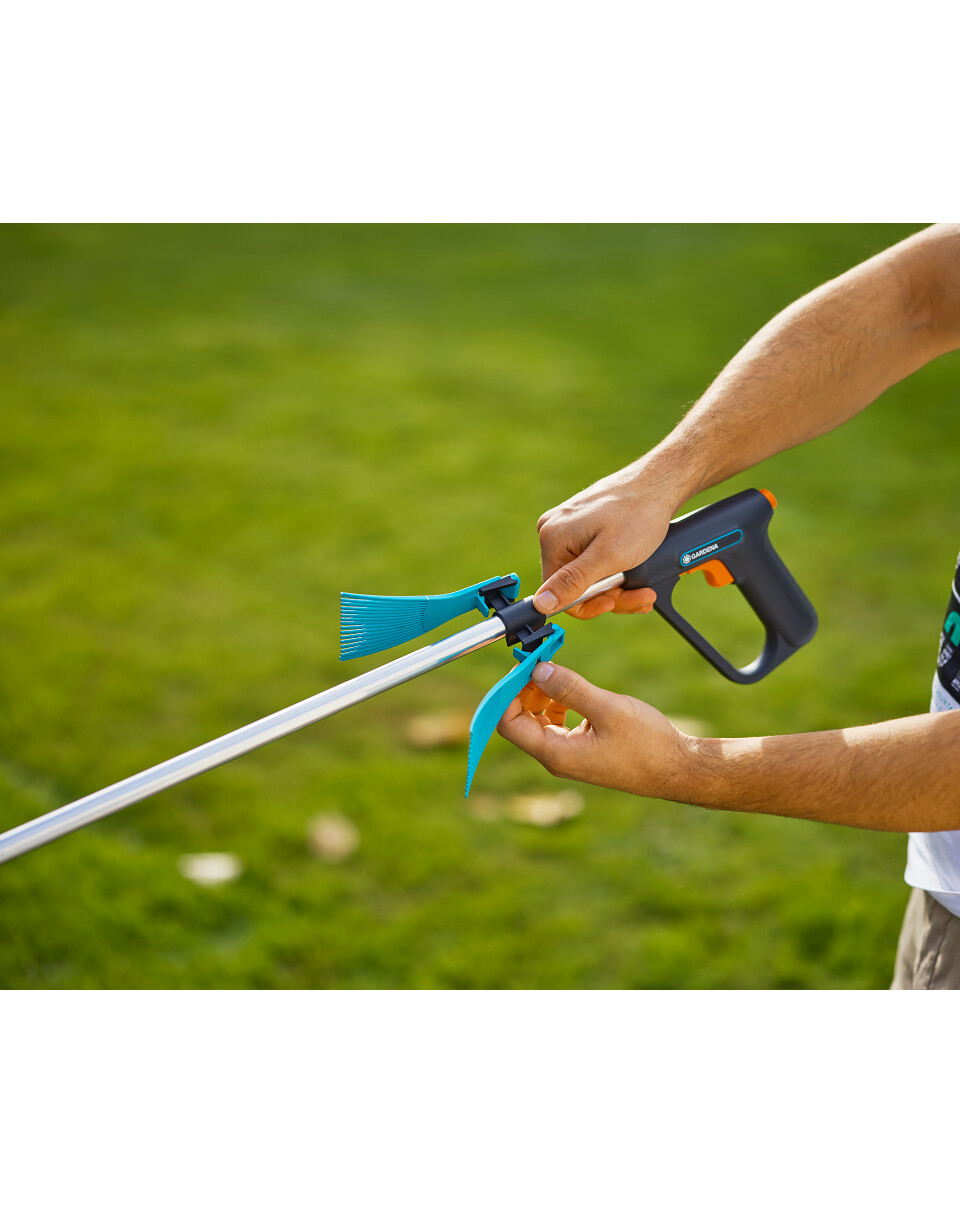 Gli accessori per afferrare, raschiare, perforare e un ulteriore accessorio per il rastrello facilitano la raccolta di rifiuti e scarti da giardino in posizione verticale, amica della schiena. Grazie alla forma ergonomica, il manico si adatta comodamente alla mano e ha una funzione di rotazione. Questo consente di lavorare sotto angolazioni diverse, particolarmente utile per rastrellare foglie o spazzatura.