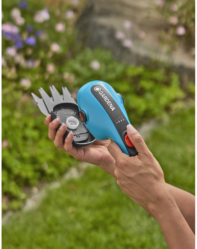 Le lame possono essere sostituite rapidamente e facilmente con un solo clic, senza l'uso di attrezzi. A seconda delle necessità, le forbici a batteria per i bordi del prato ClassicCut Li possono essere trasformate in un decespugliatore per arbusti.