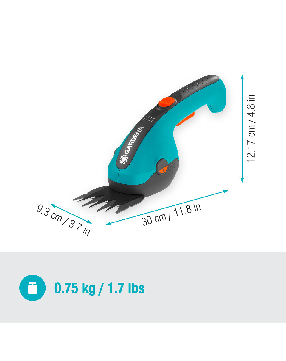 Forbici a batteria Gardena ClassicCut Li per la rifinitura precisa dei bordi del prato e per la potatura di arbusti e piccoli siepi.