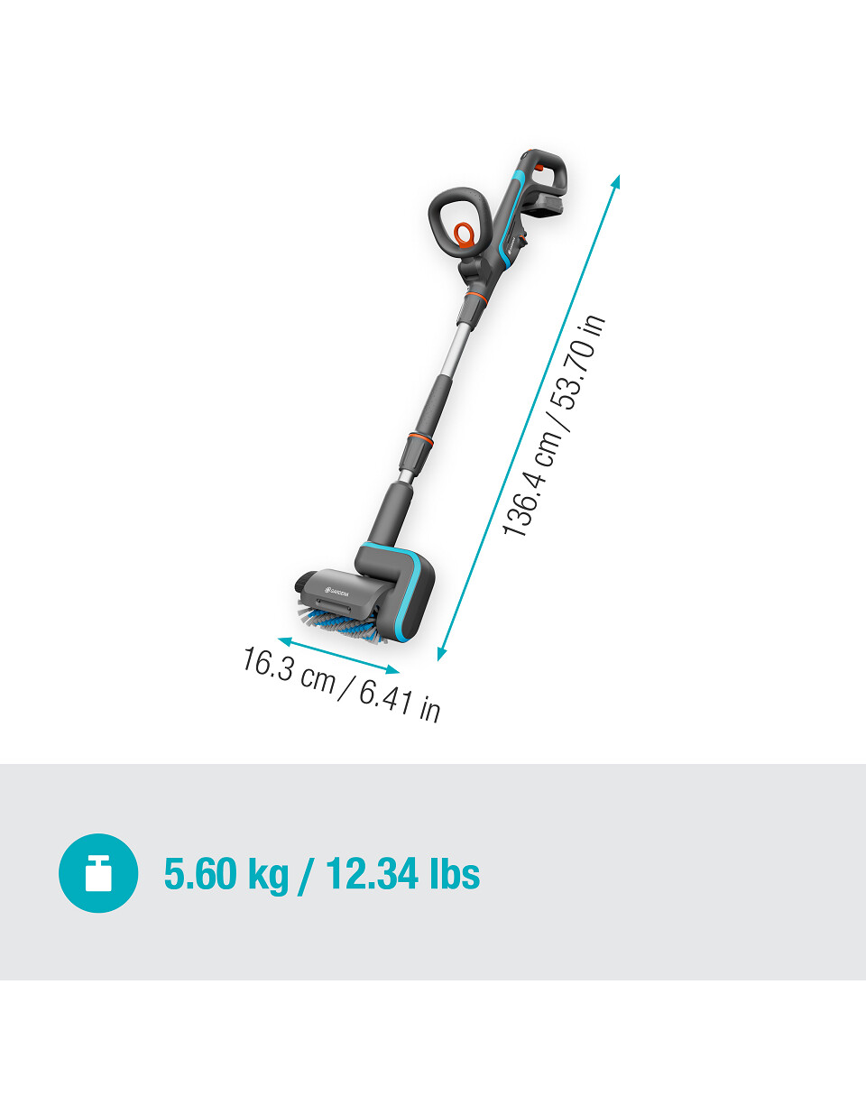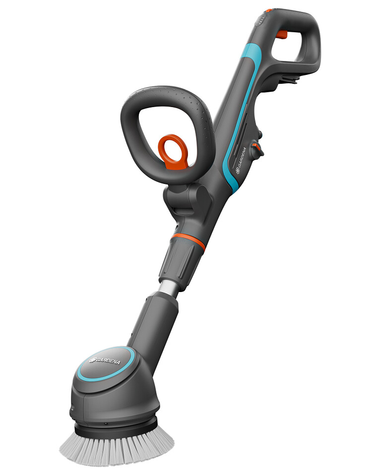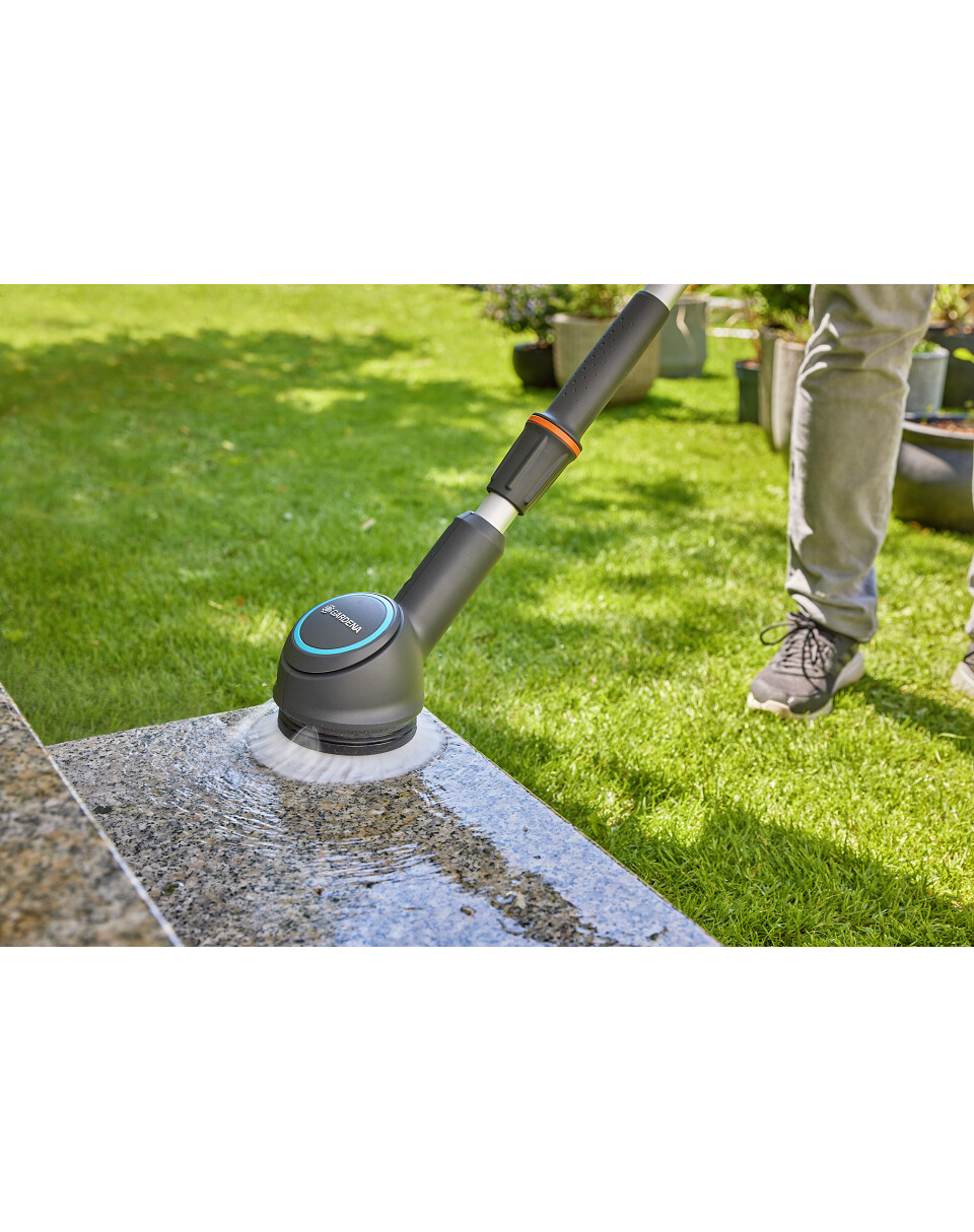 La spazzola a batteria universale GARDENA AquaBrush è una soluzione versatile per la pulizia di diverse superfici esterne.