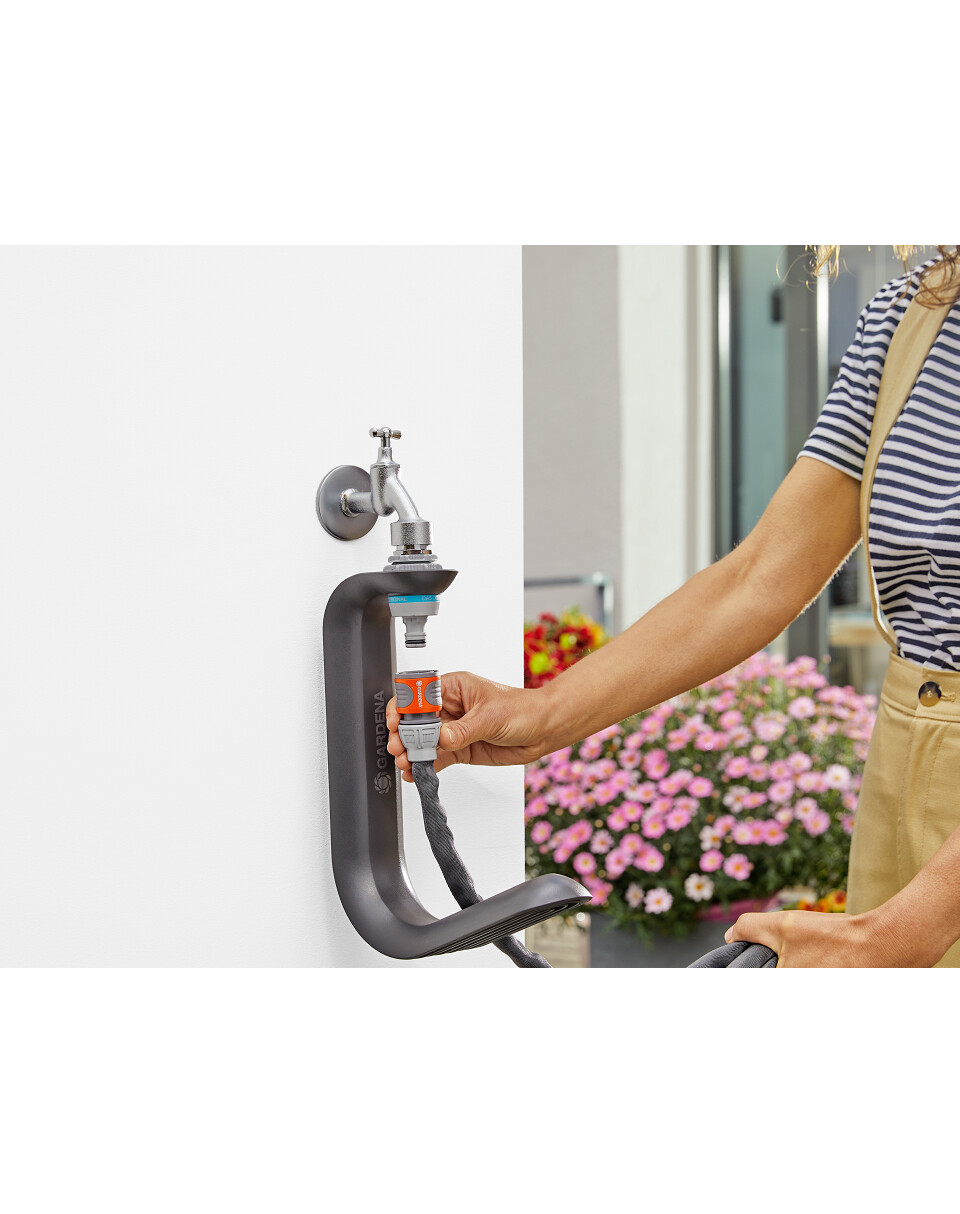Il supporto per tubo GARDENA Liano può essere rapidamente e facilmente fissato a quasi ogni rubinetto (G 1", G 3/4" e G 1/2") senza forare o utilizzare strumenti. Grazie al design intelligente, il supporto TapFix può essere montato senza forare la parete - l'installazione è semplice e non danneggia la struttura del muro. Questo tipo di supporto è ideale per i tubi tessili GARDENA Liano e può contenere tubi fino a 20 metri di lunghezza. La distanza dal rubinetto al pavimento deve essere di almeno 50 cm, poiché i supporti per tubi TapFix Liano e i tubi tessili Liano possono essere conservati sui rubinetti tutto l'anno grazie alle loro proprietà resistenti ai raggi UV e al gelo.
