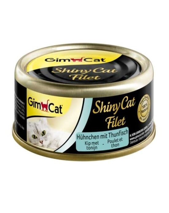 GimCat ShinyCat Filet è costituito da deliziosi pezzi di carne cotti nel brodo per preservare importanti valori nutrizionali. L'elevato contenuto proteico rafforza il sistema immunitario del gatto e protegge il suo organismo in generale. Coccolate il vostro animale con questo bocconcino incredibilmente delizioso, disponibile in quattro gusti. Grazie al basso contenuto di grassi (2%), questo alimento è adatto anche ai gatti in sovrappeso.