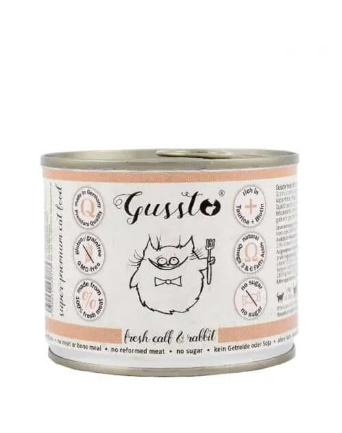 50% Vitello (di cui circa 2/3 di carne muscolare e cuore circa 1/3 di fegato e polmoni), 20% Coniglio, 28,8% brodo di carne propria, 1% minerali, 0,2% olio di cardo mariano
