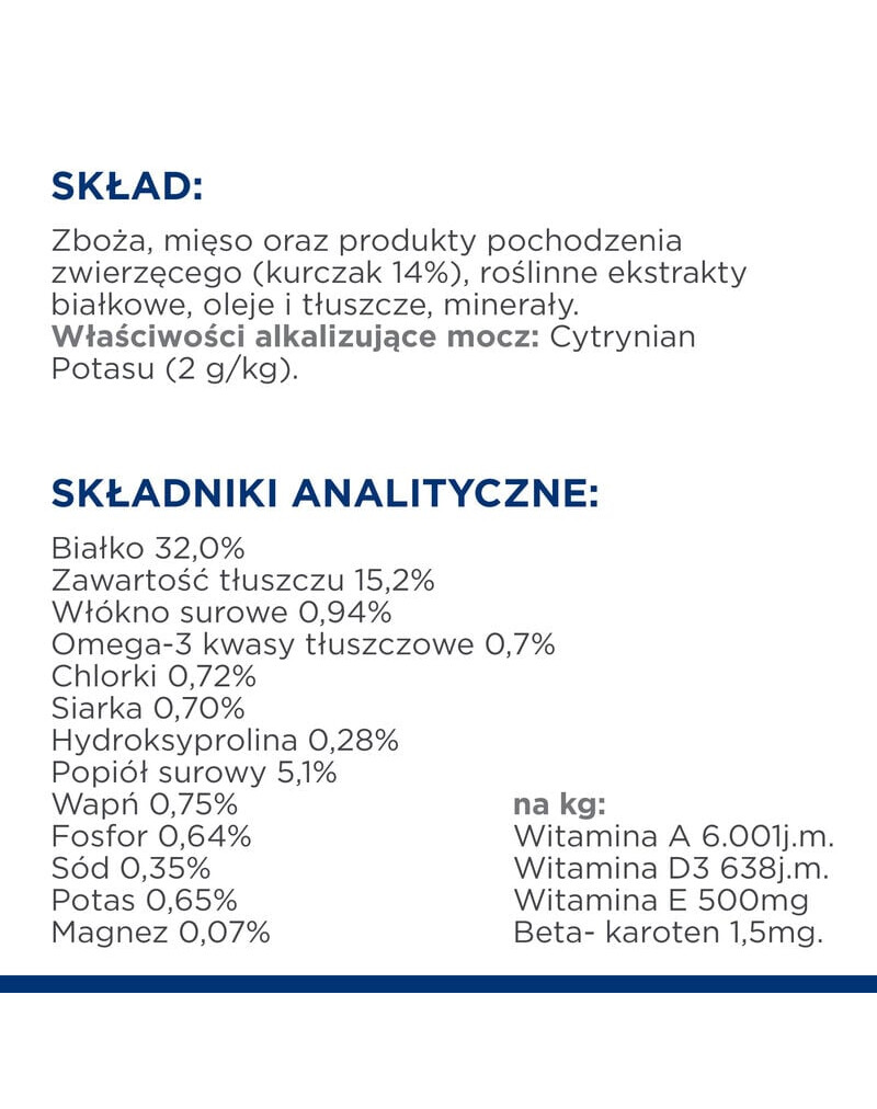 COMPOSIZIONE: cereali, carne e ingredienti animali (pollo 14%), estratti di proteine vegetali, oli e grassi, minerali. Alcalinizzanti urinari: citrato di potassio (2 g/kg).