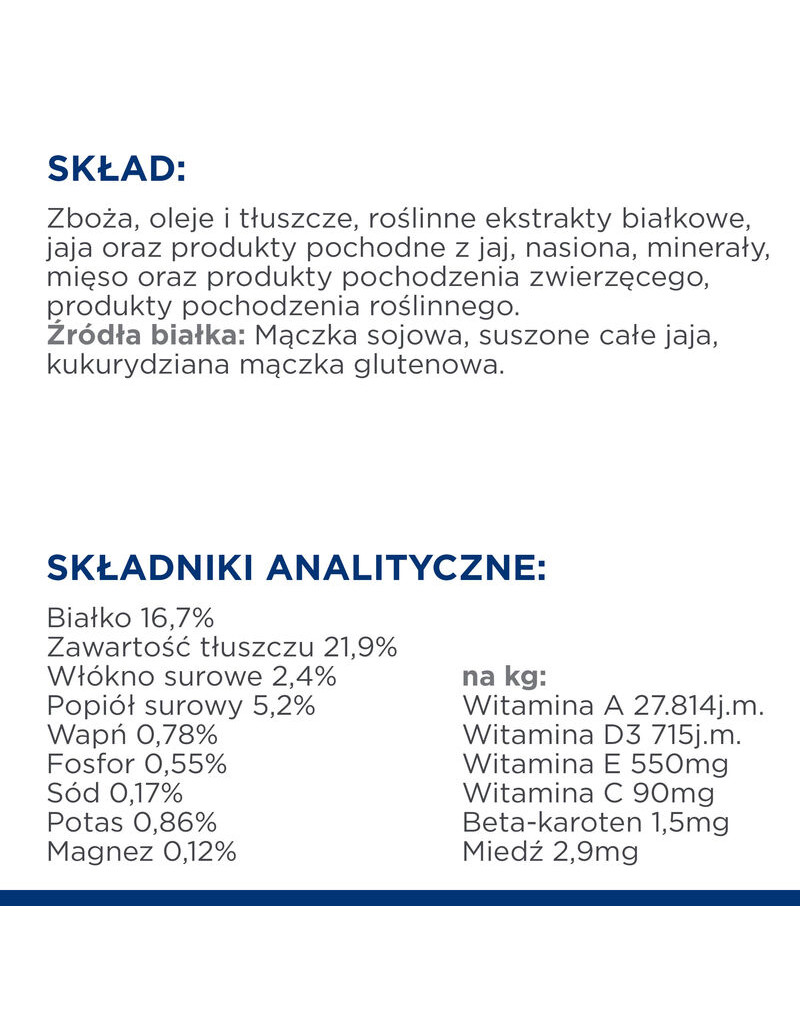 INGREDIENTI: Riso di birra, pollo, grasso di pollo, prodotto a base di uova, farina di soia, semi di lino, cellulosa in polvere, aroma di fegato di pollo, fosfato bicalcico, acido lattico, olio di soia, cloruro di potassio, polpa di barbabietola essiccata, glicerolo monostearato, carbonato di calcio, DL-metionina, vitamine (integratore di vitamina E, L-ascorbil-2-polifosfato (fonte di vitamina C), integratore di niacina, mononitrato di tiamina, integratore di vitamina A), Pantotenato di calcio, cloridrato di piridossina, biotina, integratore di vitamina B12, integratore di riboflavina, acido folico, integratore di vitamina D3, complesso menadione-sodio-bisolfito (fonte di vitamina K)), olio di pesce, cloruro di colina, Sale iodato, L-lisina, L-arginina, taurina, minerali (ossido di zinco, ossido di manganese, iodato di calcio, selenito di sodio), L-triptofano, L-carnitina, tocoferoli misti per la freschezza, aromi naturali, beta-carotene.