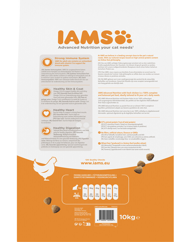 IAMS for Vitality per gatti adulti con pollo fresco è un alimento completo e bilanciato al 100%. La nuova, gustosa e migliorata ricetta contiene ben l'87% di proteine animali (del contenuto proteico totale) e tutti gli ingredienti necessari a un gatto adulto per vivere una vita sana e attiva. Il cibo delizioso non contiene additivi non necessari, coloranti o aromi artificiali o OGM. Inoltre, la nuova ricetta è senza frumento*.