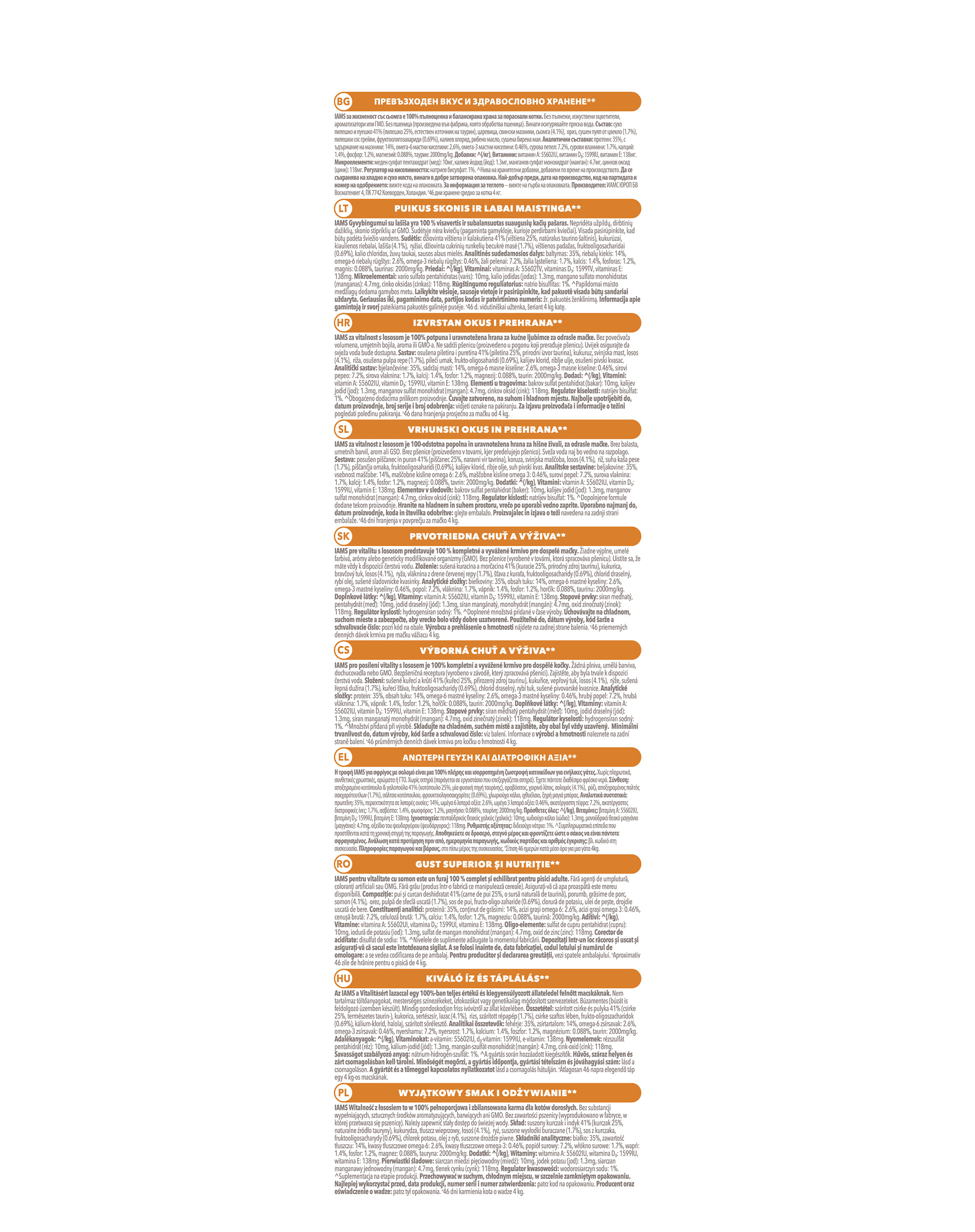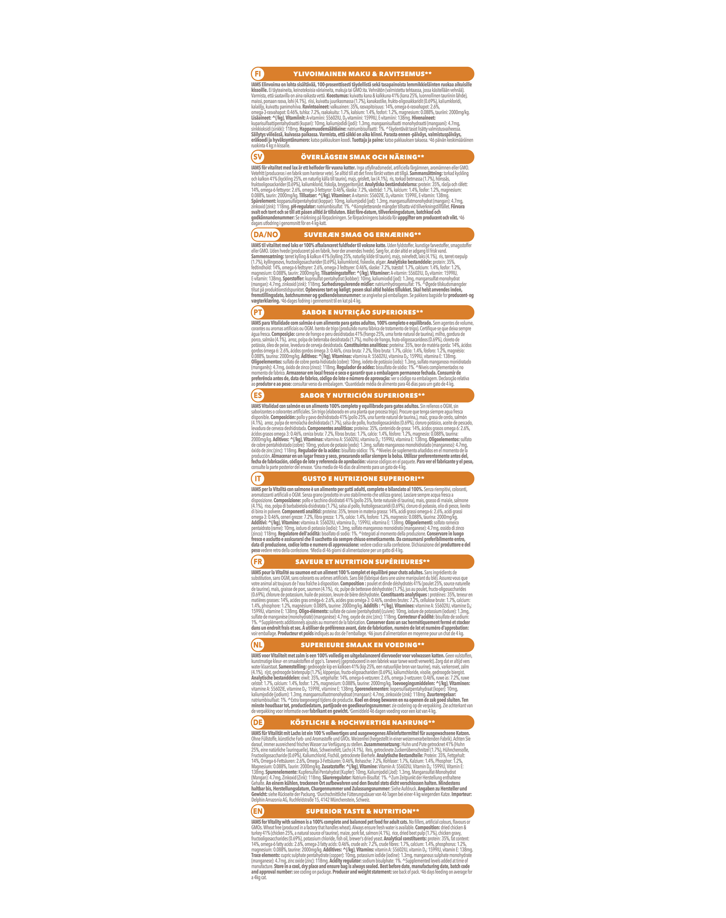 getrocknetes Huhn und Truthahn 41% (Huhn 25%, natürliche Taurinquelle), Mais, Schweinefett, Lachs (4,1%), Reis, getrocknete Rübenschnitzel (1,7%), Hühnersauce, Fructo-Oligosaccharide (0,69%), Kalium Chlorid, Fischöl, getrocknete Bierhefe