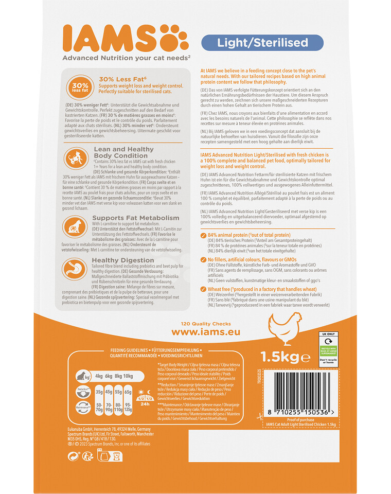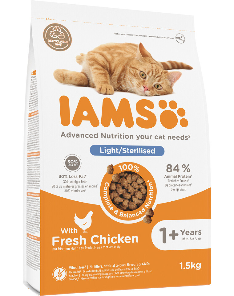 Il cibo ha un livello di grassi molto ridotto. È stato adattato alle minori esigenze energetiche dei gatti. Le proteine animali sono essenziali per il corretto funzionamento dell'organismo felino. Livelli adeguati di vitamine e minerali e un'elevata appetibilità sono i vantaggi di questo alimento.