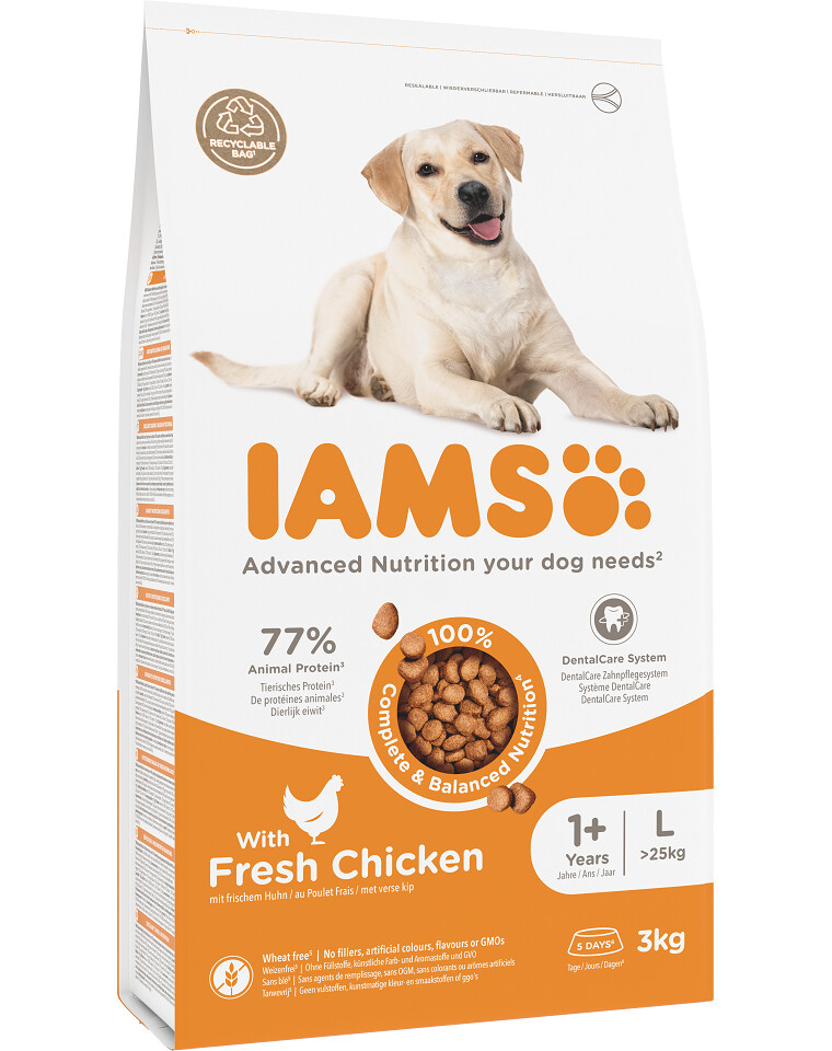La formula è priva di frumento e a base di pollo e tacchino essiccati. Il 77% di proteine animali aiuta a costruire una massa muscolare adeguata e un osso sano per il cane. Gli acidi grassi insaturi Omega-3 e -6 favoriscono la salute della pelle e del mantello del cane. Un'adeguata miscela antiossidante di vitamine C ed E supporta il sistema immunitario del cane.