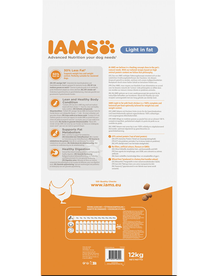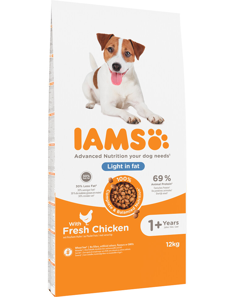 La ricetta è a ridotto contenuto calorico. È a base di mais e pollame essiccato (pollo e tacchino). L'olio di pesce fornisce acidi grassi insaturi Omega-3 e Omega-6. Il 69% delle proteine è costituito da proteine animali, le uniche preziose per i cani. Una miscela antiossidante di vitamina C ed E supporta il sistema immunitario del cane.