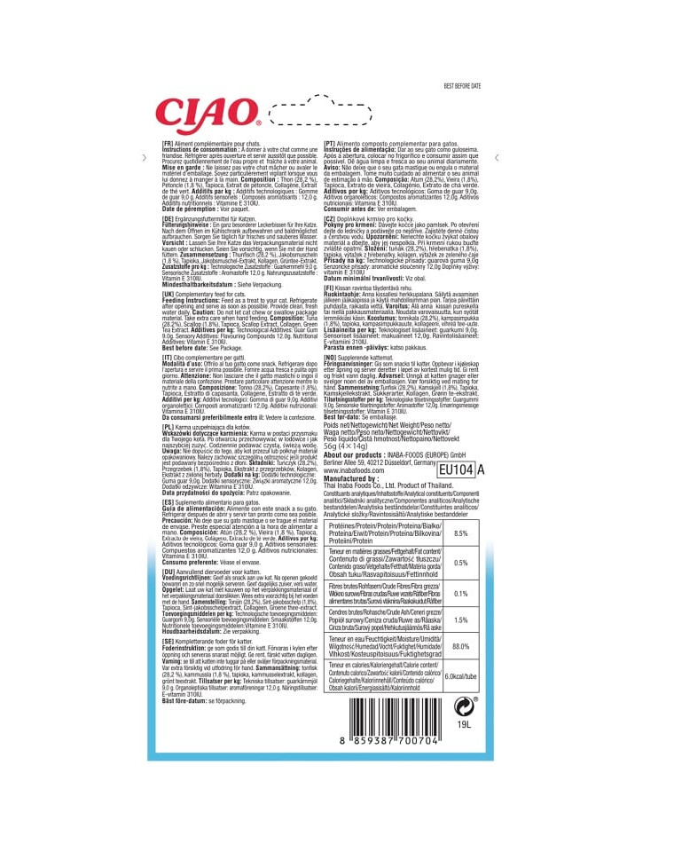 Tonno (28,2%), capasanta (1,8%), tapioca, estratto di capasanta, collagene, estratto di tè verde