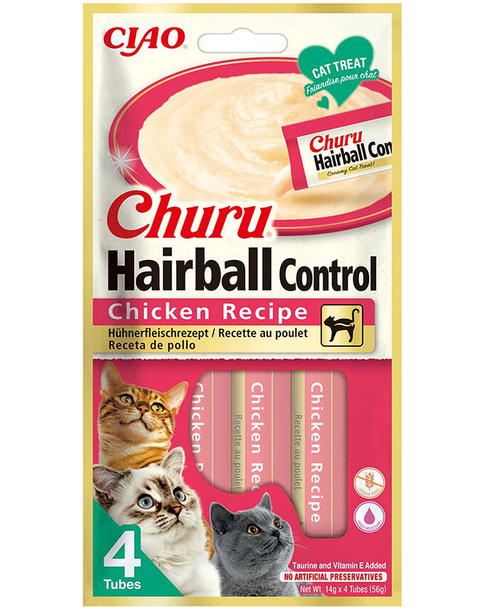 Churu Hairball Control è una nuova aggiunta alla gamma di salse più vendute, note per la loro consistenza vellutata e l'alto contenuto di umidità. Ricco di fibre vegetali insolubili e chitosano, aiuta a mantenere sano il tratto digestivo e a combattere i boli di pelo. Contiene inoltre la turina, un aminoacido chiave essenziale per i gatti per il corretto funzionamento di molti organi.