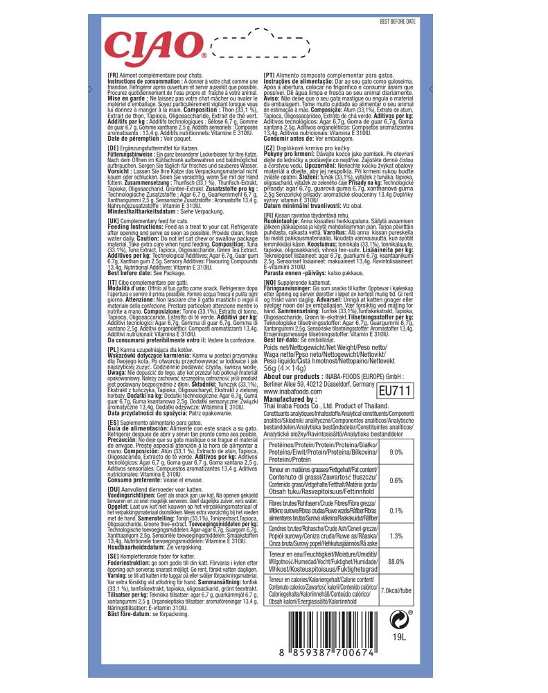 INGREDIENTI : Tonno 33,3%, estratto di tonno, estratto di tè verde. Additivi tecnologici per kg: agar 6,7 g, gomma guar 6,7 g, gomma xanthan 1,7 g.