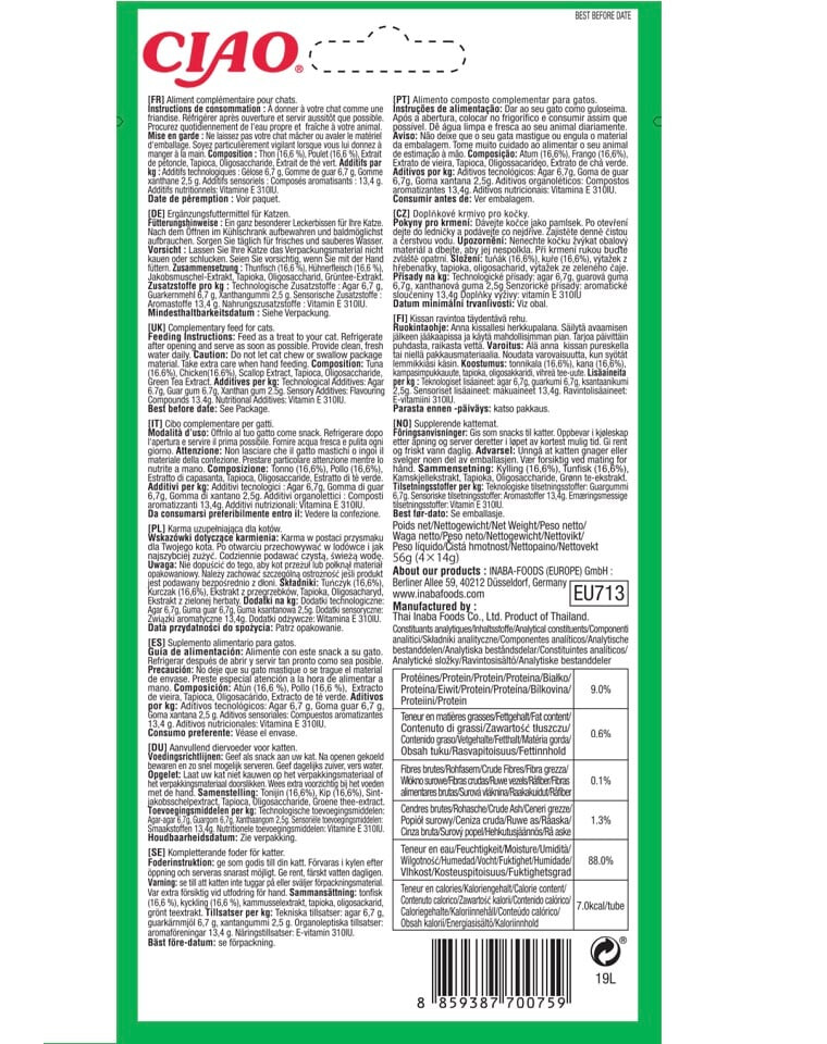 INGREDIENTI : Tonno 16,7%, pollo 16,7%, estratto di tonno, estratto di tè verde. Additivi tecnologici per kg: agar 6,7 g, gomma guar 6,7 g, gomma xanthan 1,7 g. Additivi sensoriali: composti aromatici 11,3 g.