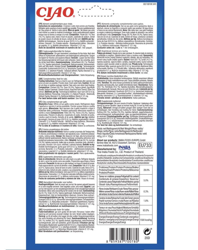 INGREDIENTI: Pollo (59,1%), tonno (16,3%), tapioca (essiccata), albume d'uovo in polvere, caseinato di sodio, estratto di pollo, estratto di lievito, estratto di tè verde.