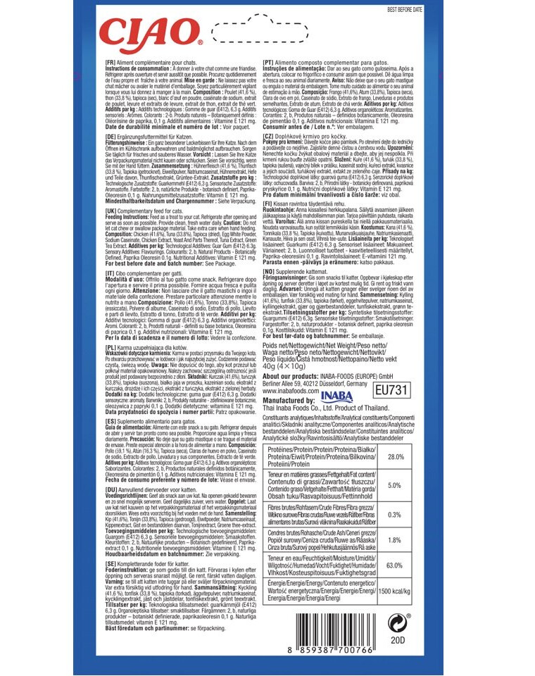 INGREDIENTI: Pollo (41,6%), Tonno (33,8%), Tapioca (essiccata), albume d'uovo in polvere, caseinato di sodio, estratto di pollo, estratto di lievito, estratto di tonno, estratto verde.