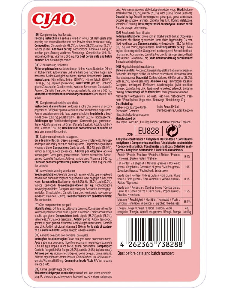 Ingredienti: brodo aromatizzato al pollo (68,0%), pollo (28,0%), salmone (2,0%), tapioca (essiccata). Additivi per kg: Additivi tecnologici: gomma di guar, gomma di xantano. Additivi sensoriali: aromi, Camellia thea Link. Additivi dietetici: vitamina E 560 mg.