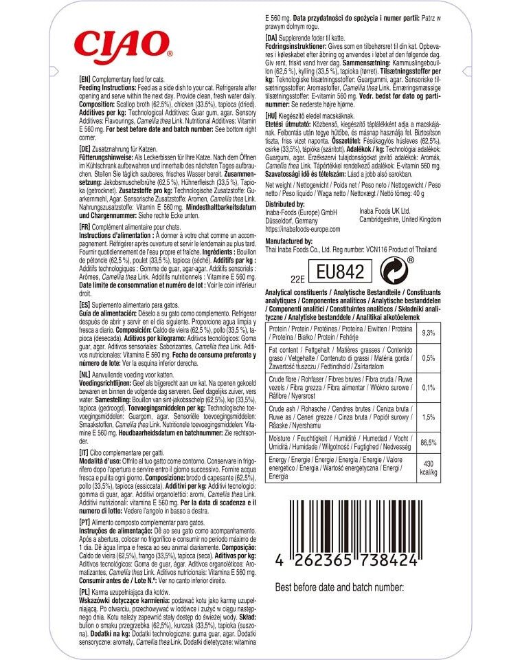 Istruzioni per l'alimentazione: alimento complementare sotto forma di leccornia per il gatto. Questo prodotto deve essere somministrato solo in aggiunta ad altri alimenti o tra i pasti. Assicurarsi che il gatto abbia costantemente accesso a una ciotola d'acqua fresca. Conservare in un luogo asciutto e fresco, lontano dalla luce diretta del sole. Una volta aperto, conservare in frigorifero e utilizzare il prima possibile.