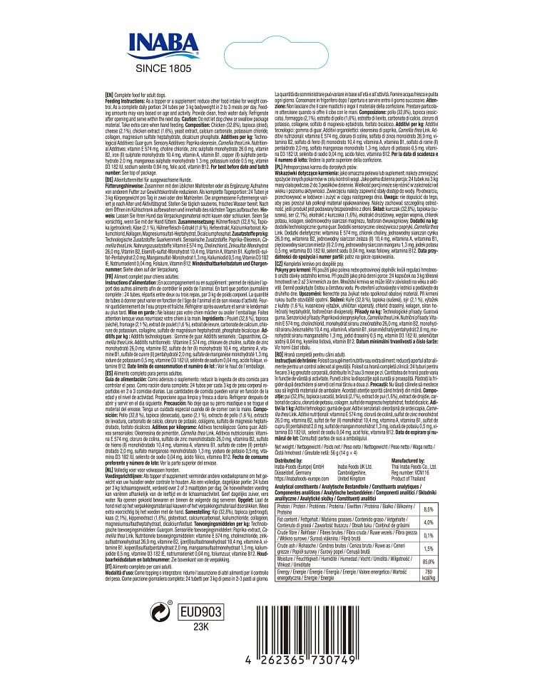 Ingredienti: pollo (32,8%), tapioca (essiccata), formaggio (2,1%), estratto di pollo (1,6%), estratto di lievito, carbonato di calcio, cloruro di potassio, collagene, solfato di magnesio eptaidrato, fosfato bicalcico. Additivi per 1 kg: Additivi tecnologici: gomma di guar. Additivi sensoriali: oleoresina di paprica, Camellia thea Link. Additivi alimentari: vitamina E 574 mg, cloruro di colina, solfato di zinco monoidrato 26,0 mg, vitamina B2, solfato di ferro (II) monoidrato 10,4 mg, vitamina A, vitamina B1, solfato di rame (II) pentaidrato 2,0 mg, solfato di manganese monoidrato 1,3 mg, ioduro di potassio 0,5 mg, vitamina D3 182 UI, selenito di sodio 0,04 mg, acido folico, vitamina B12.