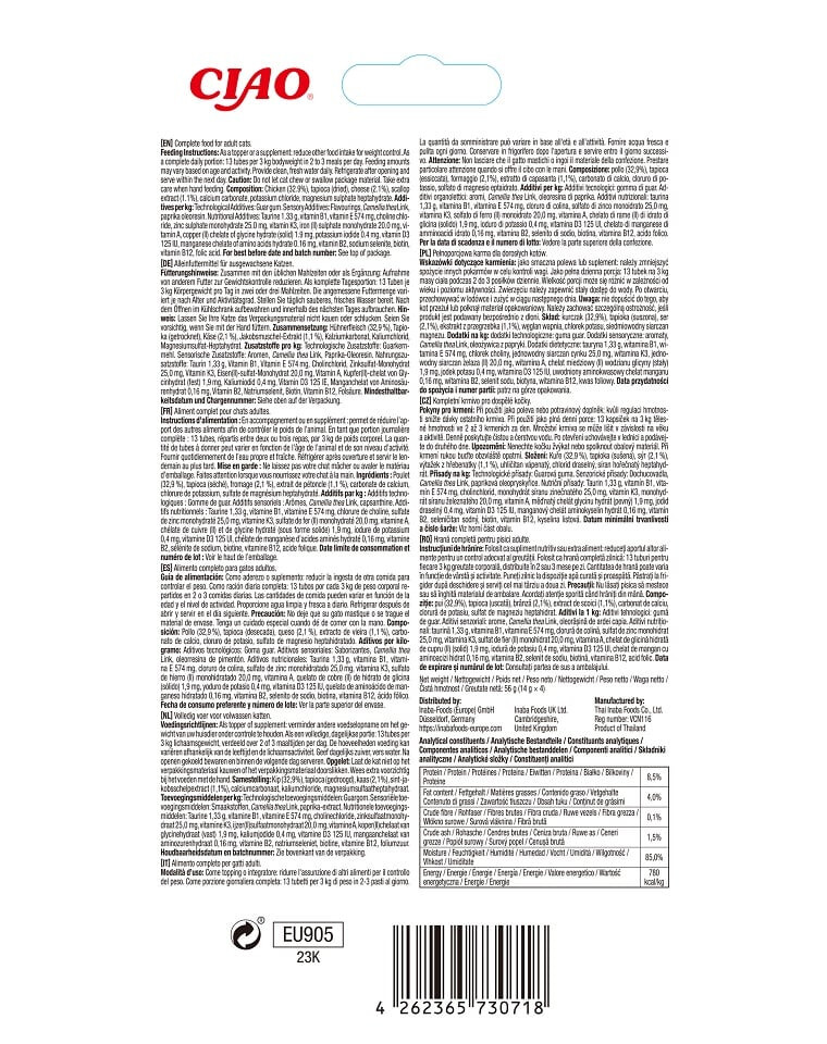 Ingredienti: pollo (32,9%), tapioca (essiccata), formaggio (2,1%), estratto di capesante (1,1%), carbonato di calcio, cloruro di potassio, solfato di magnesio eptaidrato. Additivi per 1 kg: Additivi tecnologici: gomma di guar. Additivi sensoriali: aromi, oleoresina di paprica, Camellia thea Link. Additivi dietetici: Taurina 1,33 g, vitamina B1, vitamina E 574 mg, cloruro di colina, solfato di zinco monoidrato 25,0 mg, vitamina K3, solfato di ferro (II) monoidrato 20,0 mg, vitamina A, rame (II) chelato di glicina idrato (solido) 1,9 mg, ioduro di potassio 0,4 mg, vitamina D3 125 UI, manganese aminoacido chelato idrato 0,16 mg, vitamina B2, selenito di sodio, biotina, vitamina B12, acido folico.