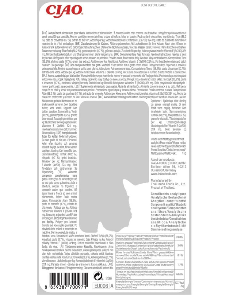 INGREDIENTI: Tonno (88,2%), pasta di gamberi (0,7%), estratto di tè verde