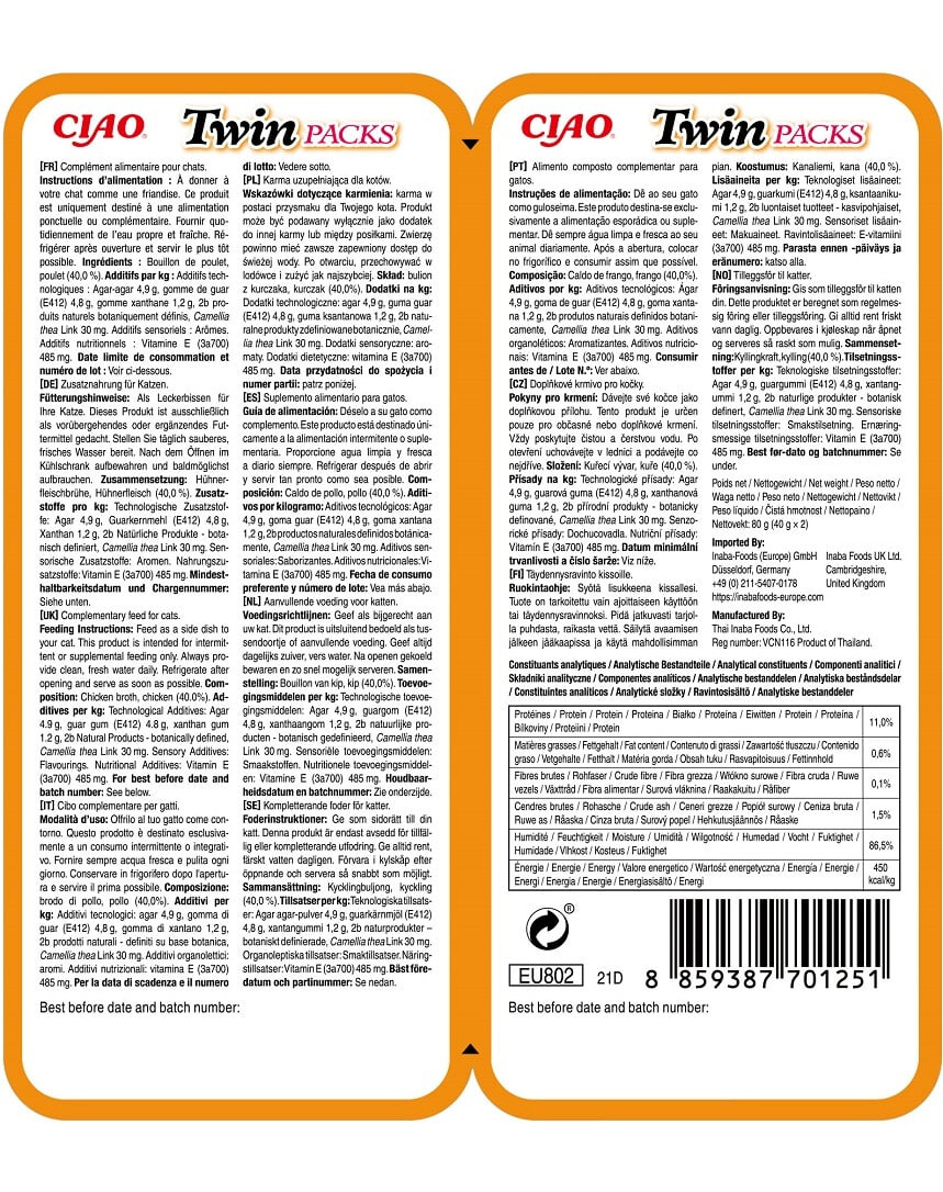 Ingredienti: brodo di pollo, pollo (40,0%). Additivi per 1 kg: Additivi tecnologici: agar 4,9 g, gomma di guar (E412) 4,8 g, gomma di xantano 1,2 g, 2b prodotti naturali botanicamente definiti, Camellia thea Link 30 mg. Additivi sensoriali: aromi. Additivi alimentari: vitamina E (3a700) 485 mg.