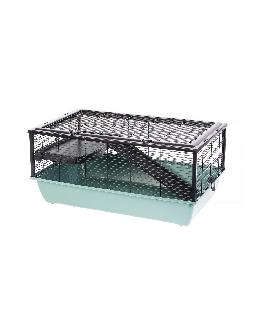 Gabbia per roditori. Viene fornita con attrezzature adatte ai roditori. Un ripiano in plastica e una scaletta consentono di giocare in sicurezza. La lettiera della gabbia è profonda, in modo che la segatura o il substrato non fuoriescano dal vassoio. Il vostro animale è libero di scavare e giocare nella segatura e voi potete godervi la pulizia della stanza!