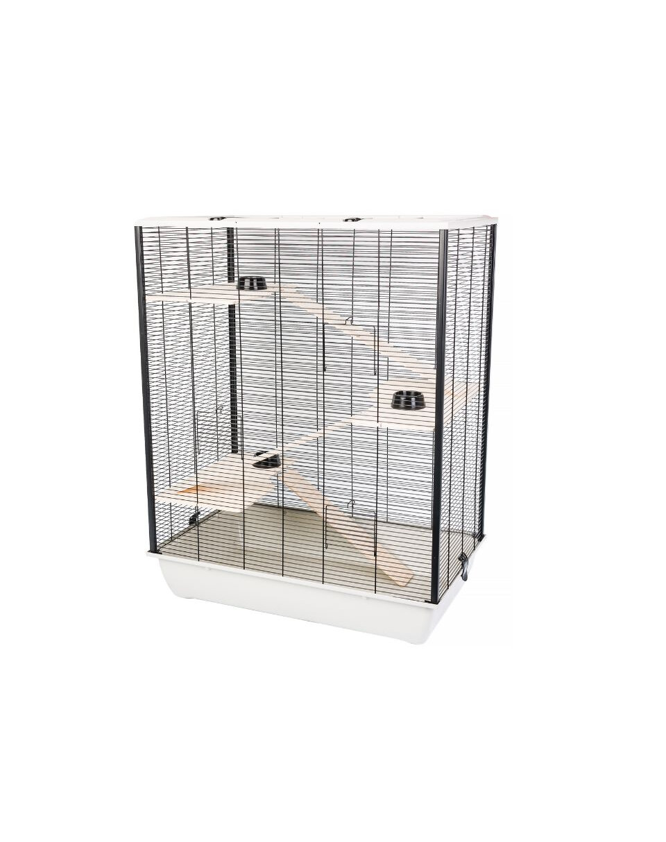 La lettiera in plastica impedisce la fuoriuscita dei rifiuti, per una pulizia facile e veloce. La gabbia ha un tetto ad apertura totale.