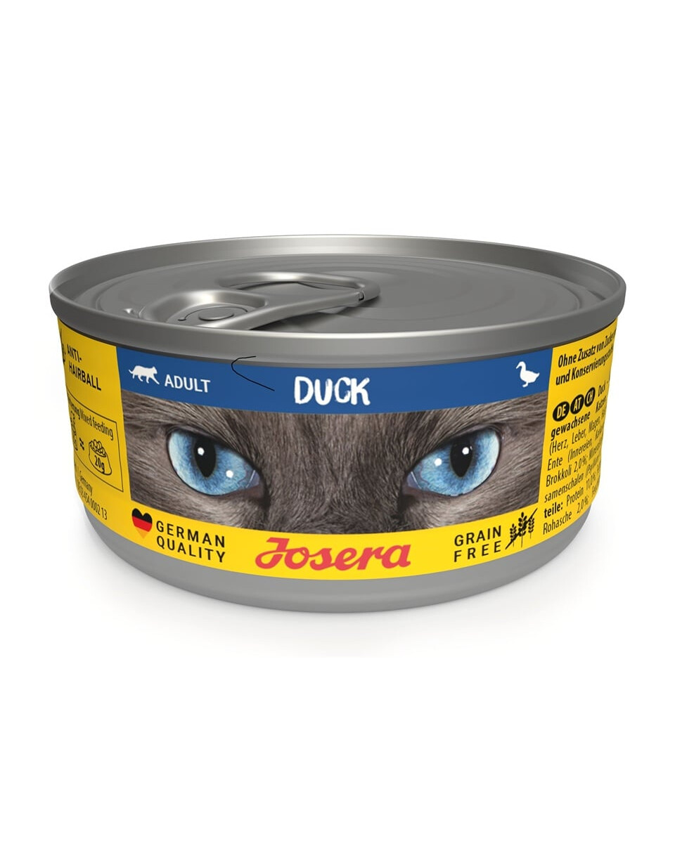 Quando il tuo animale mangia con gusto, anche il suo proprietario è soddisfatto. Questo è un ulteriore motivo per prendersi cura di una deliziosa varietà nella dieta – ad esempio scegliendo il nostro nuovo cibo umido Josera Duck in lattina! Il sapore dell'anatra incoraggia anche i gatti più schizzinosi a mangiare. Il cibo Duck in lattina fornisce ai gatti una maggiore dose di liquidi, il che è prezioso per i gatti che bevono poco acqua.