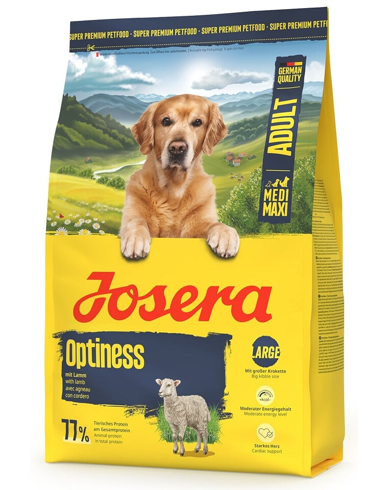 JOSERA Optiness Adult è un alimento secco completo creato appositamente per cani di taglia media e grande. Grazie alla ricetta con agnello e riso, garantisce un'ottima tolleranza ed è adatto anche per animali esigenti.
