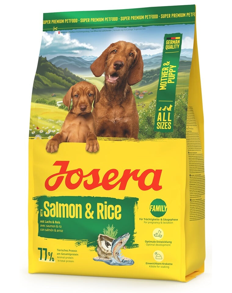 Cibo completo di alta qualità sviluppato appositamente per fattrici in gravidanza, madri in allattamento e cuccioli fino a 8 settimane di vita. JOSERA Mother & Puppy Salmon with Rice è un delicato cibo senza glutine con salmone e riso, che fornisce tutti i nutrienti essenziali per supportare lo sviluppo sano dei giovani cani e la condizione delle loro madri durante il periodo impegnativo della gravidanza e dell'allattamento.