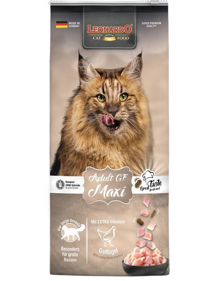 Alimento secco senza cereali per gatti adulti (a partire da un anno di età). Particolarmente indicato per le razze di taglia grande.